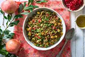 סלט שהוא חגיגה של טעמים ומרקמים. קצת מתוק וצ'ואי מהתמרים, קצת עסיסי מהאגסים, קצת מלוח ובועט מעשבי התיבול והבורגול וגם קראנצ'י בזכות הפקאנים. הכל בסלט אחד…